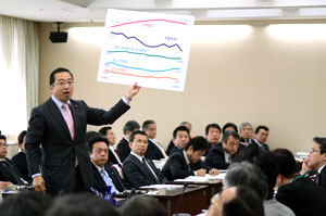 中山市議が人工島事業の中止、「稼ぐ都市」論を撤回して内需をあたためる施策への予算組み替えを提案すると、市長は内需をあたためることには同意したものの、「稼ぐ都市」論には固執し、人工島事業についても「最善の方向へ導く」として推進姿勢を示しました。